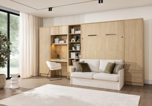 Nos lits escamotables 2 personnes s’adaptent à tous les styles de vie. Vous pouvez opter pour un lit bureau escamotable idéal pour créer un coin travail fonctionnel, ou une armoire lit escamotable qui se fond dans votre décor. Les modèles comme le lit bibliothèque escamotable ou le lit rabatable avec canapé sont parfaits pour les petits espaces, transformant une pièce en un clin d’œil.