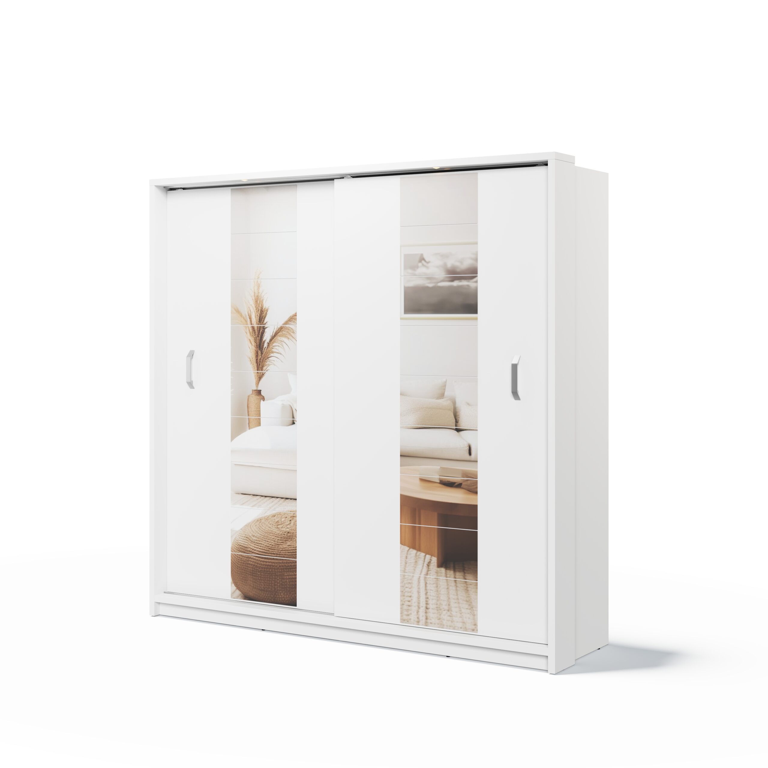 Le dressing ARIANNA affiche une finition blanche qui s’adapte facilement à tous les styles d’intérieur. Il complète aussi bien une déco moderne, scandinave ou classique, sans alourdir visuellement l’espace. Ses deux grands miroirs intégrés sur les portes agrandissent la pièce et diffusent la lumière. Ses poignées au design original accentuent son style contemporain.