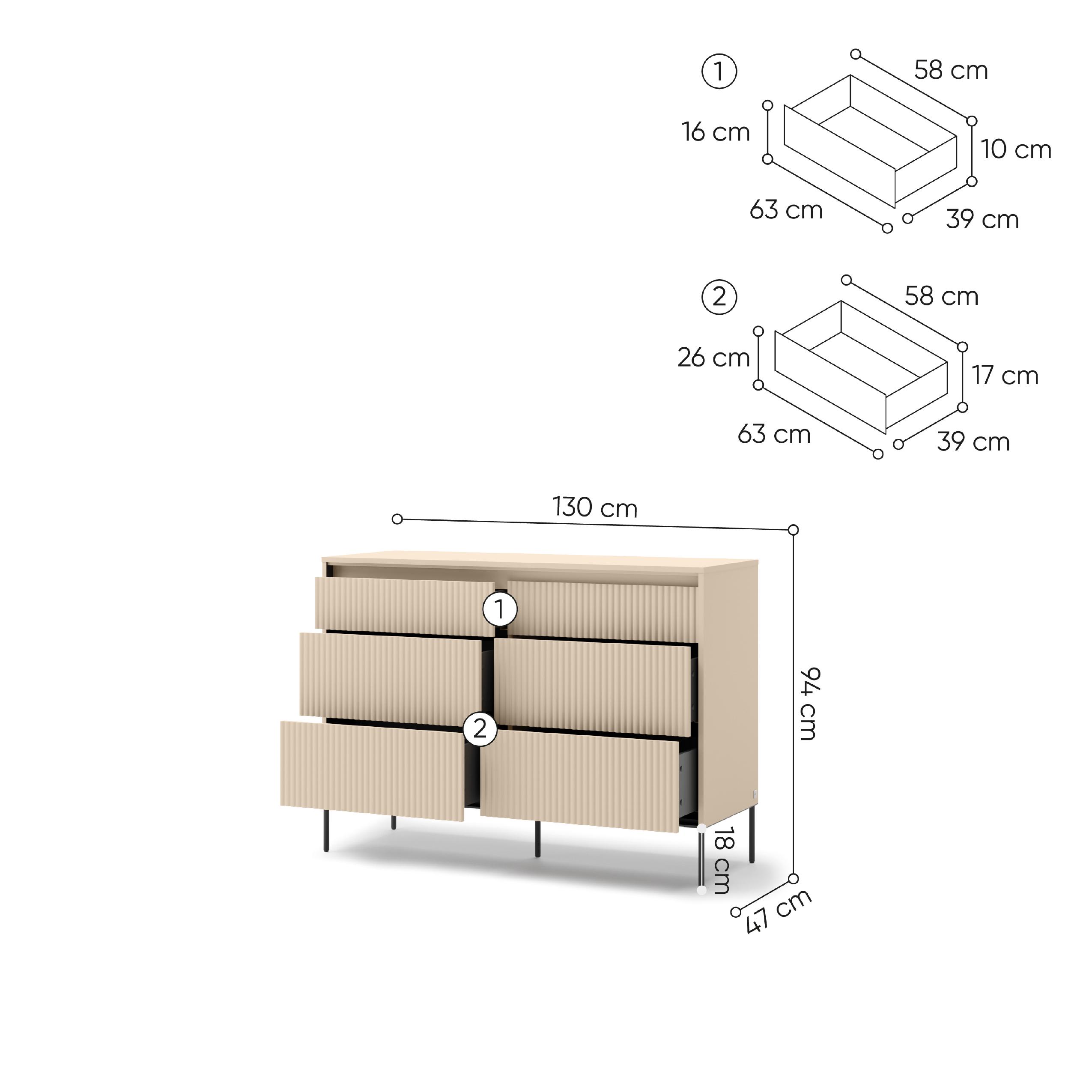 - Commode 6 tiroirs 130 cm Beige – STELLA : 6 tiroirs spacieux pour un rangement optimisé