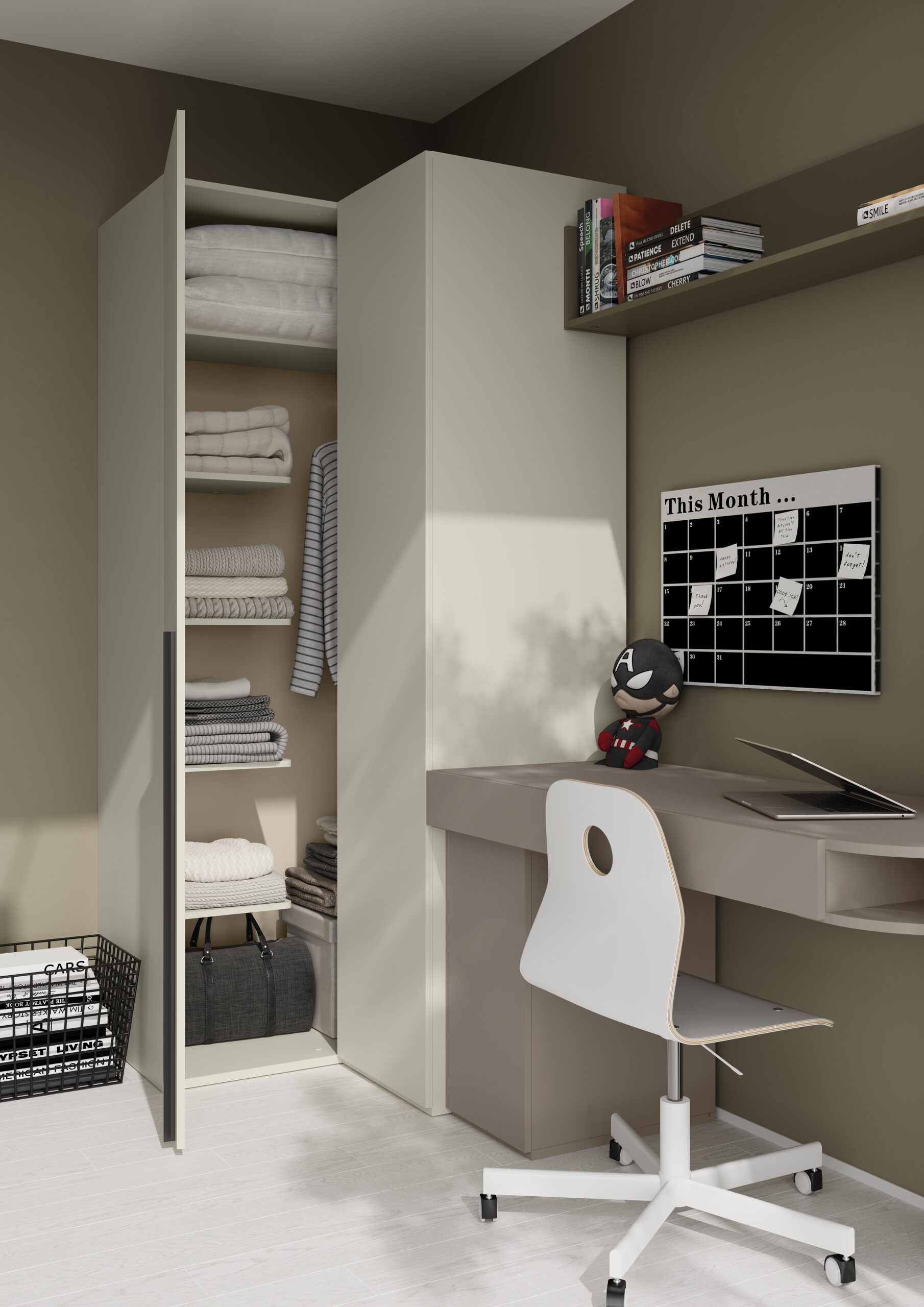 Le système d’ouverture push-open, sans poignée visible, accentue le côté épuré et design de ce meuble compact. Ce détail confère à l’ensemble une esthétique soignée et discrète, idéale pour une chambre ado où style et praticité doivent cohabiter.
