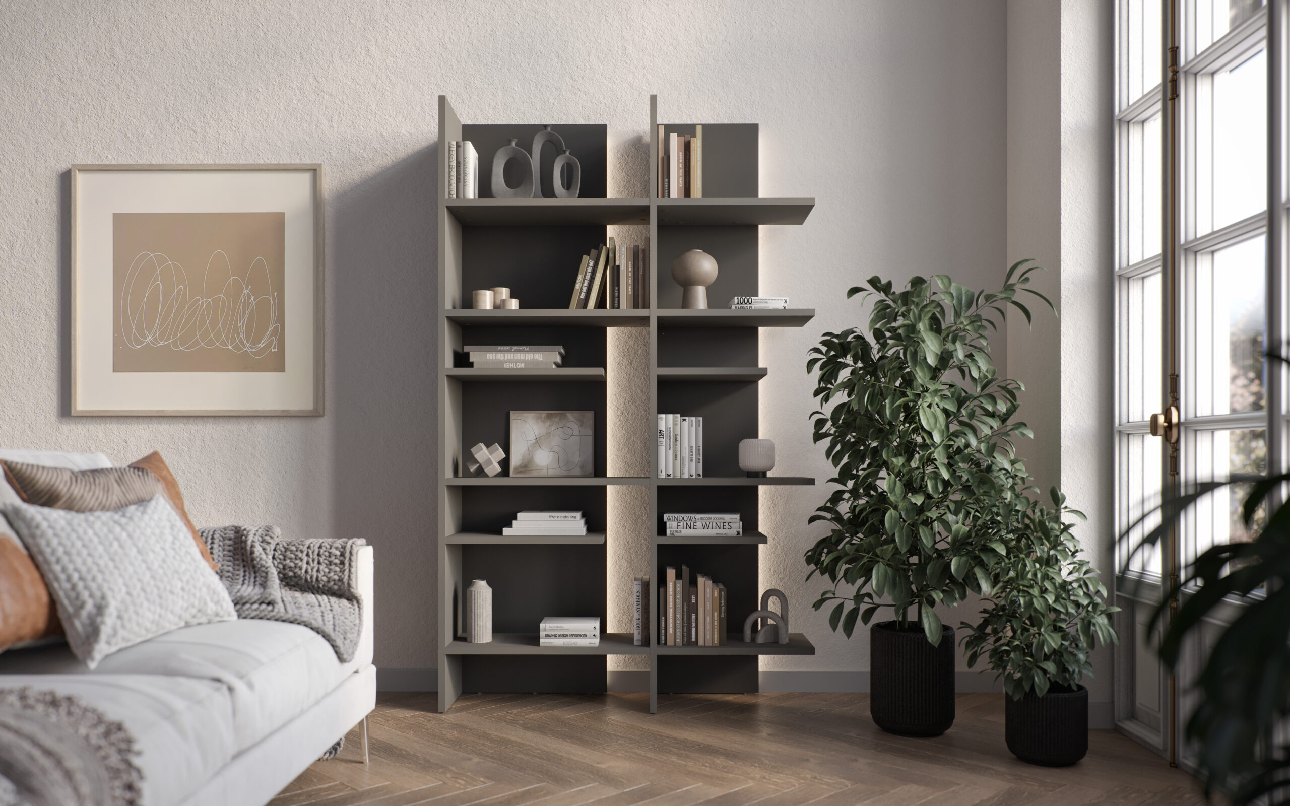 - Bibliothèque en bois moderne avec ouverture à droite : Idéale pour mettre en valeur vos objets déco.