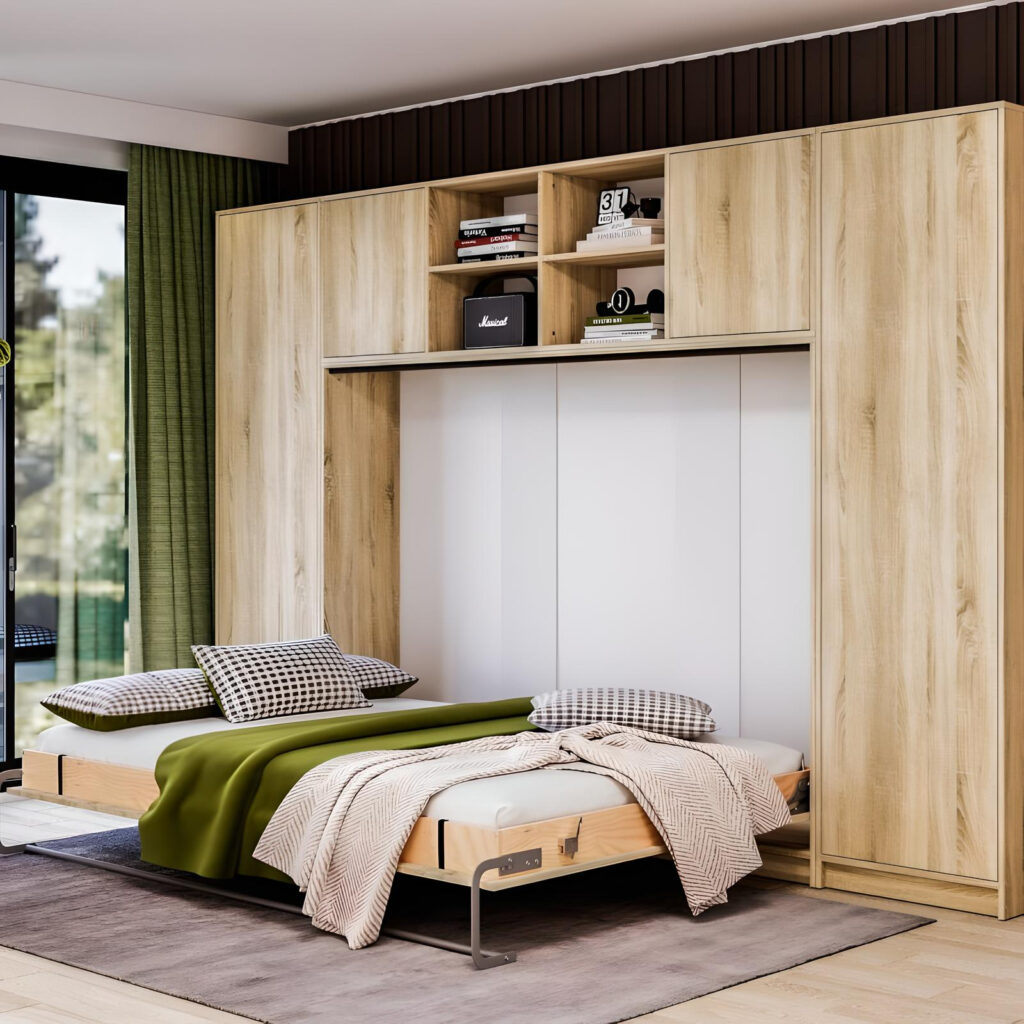 Le lit, c’est souvent le meuble le plus encombrant. Dans un studio, il peut manger la moitié de l’espace de vie. La solution ? Le faire disparaître le jour. Le lit escamotable est une révolution pour les petits espaces. Vertical ou horizontal, il se rabat contre le mur en un clin d’œil et libère une surface au sol GIGANTESQUE.